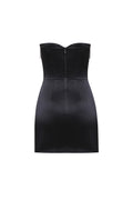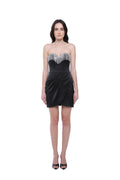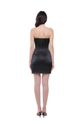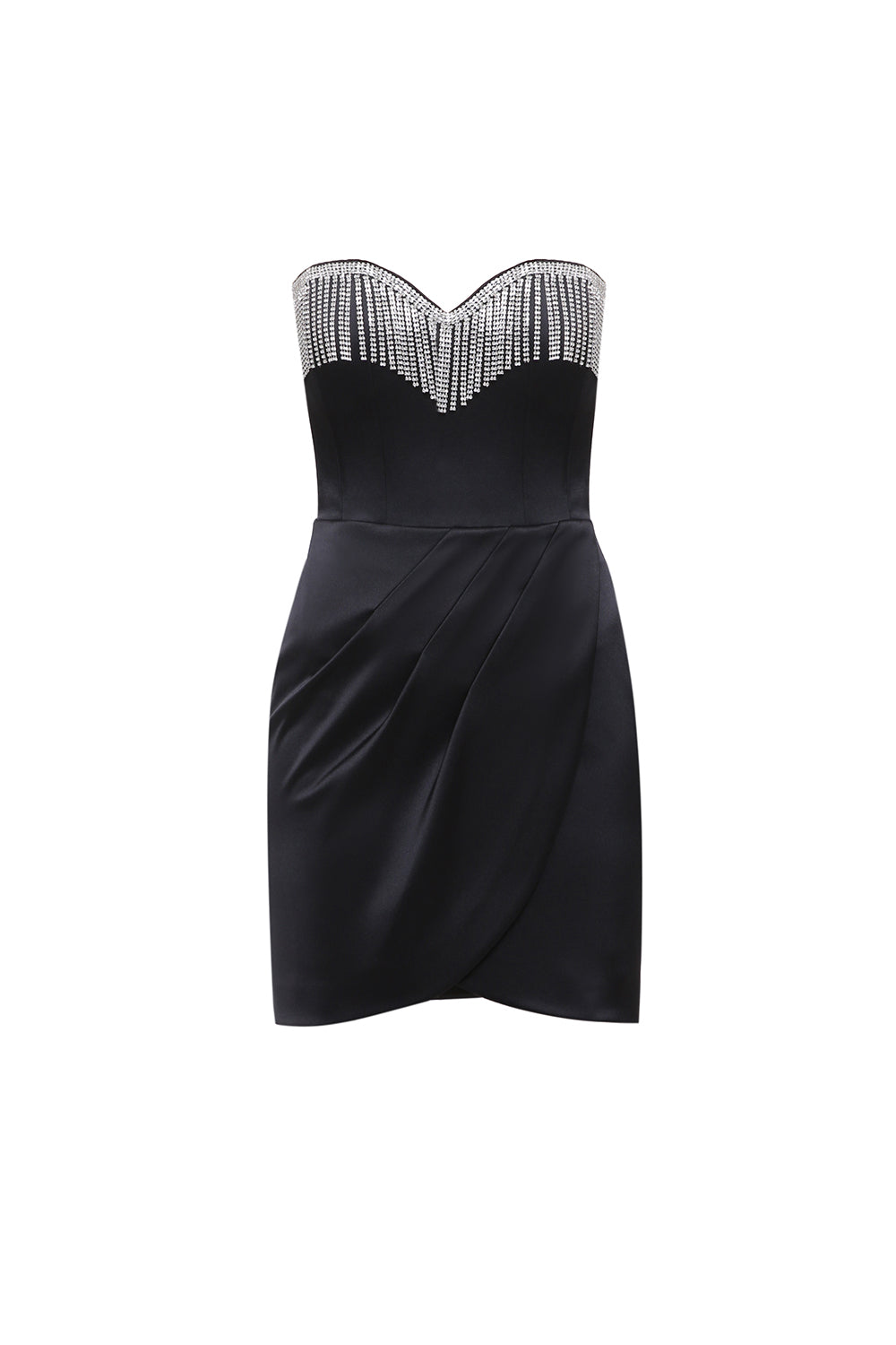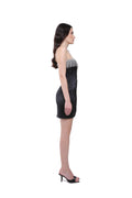 Strapless mini dress crafted from smooth satin featuring a structured bodice adorned with shimmering crystal fringe. The draped skirt creates an elegant and modern evening silhouette.