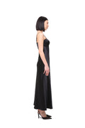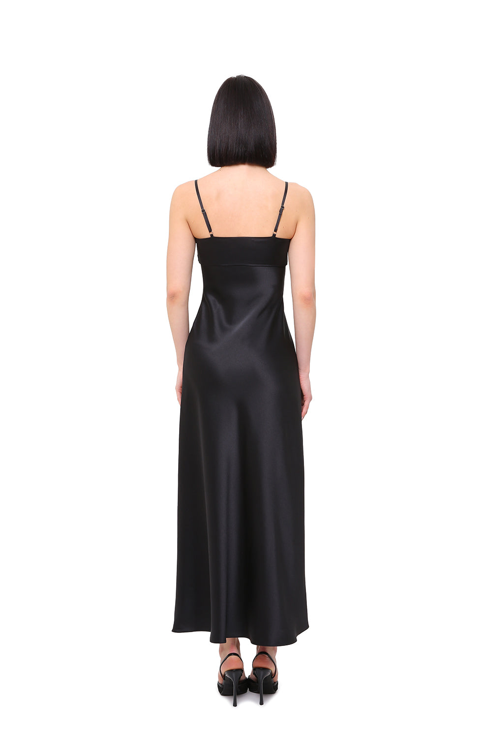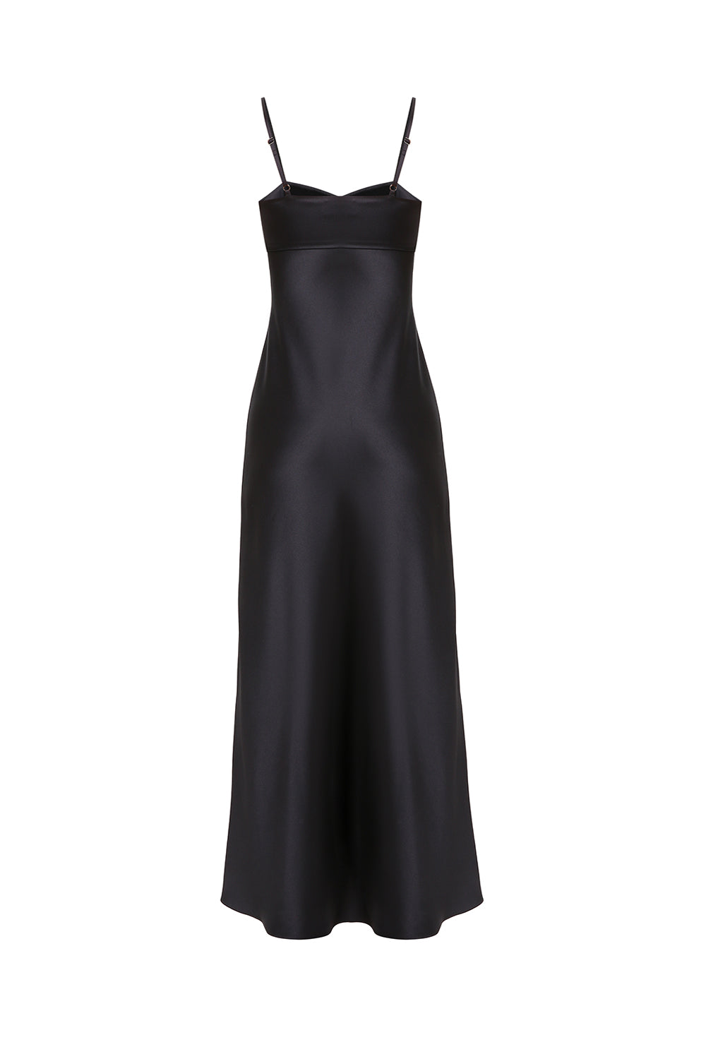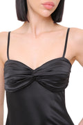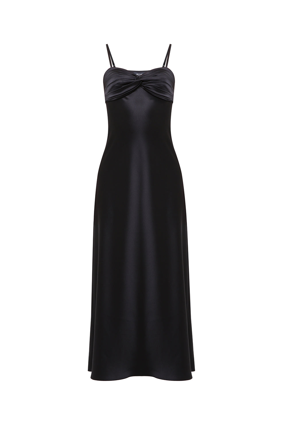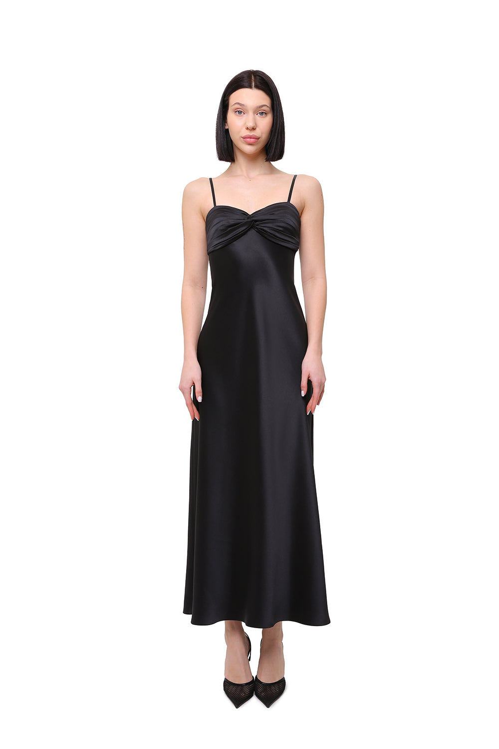 Elegant satin dress featuring a softly draped bodice that gently shapes the neckline, creating a delicate and refined look. The silhouette flows smoothly along the body, offering a clean and graceful finish.