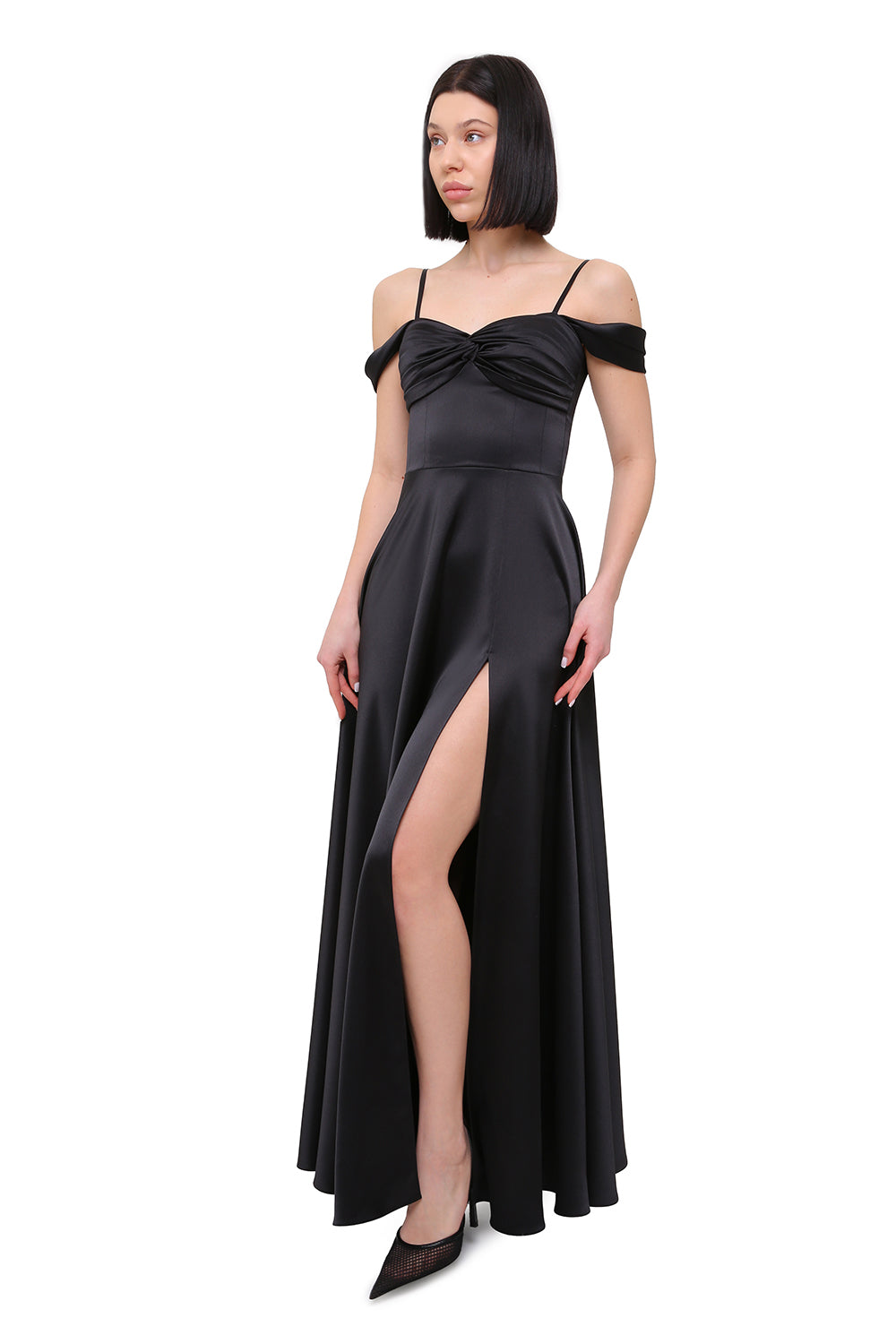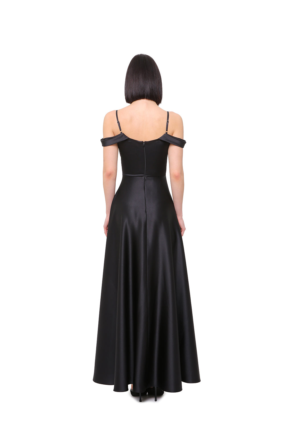 A fluid satin dress with a soft off-shoulder neckline that delicately frames the shoulders and collarbone. The structured bodice enhances the silhouette, while the flowing skirt creates graceful movement with every step.