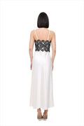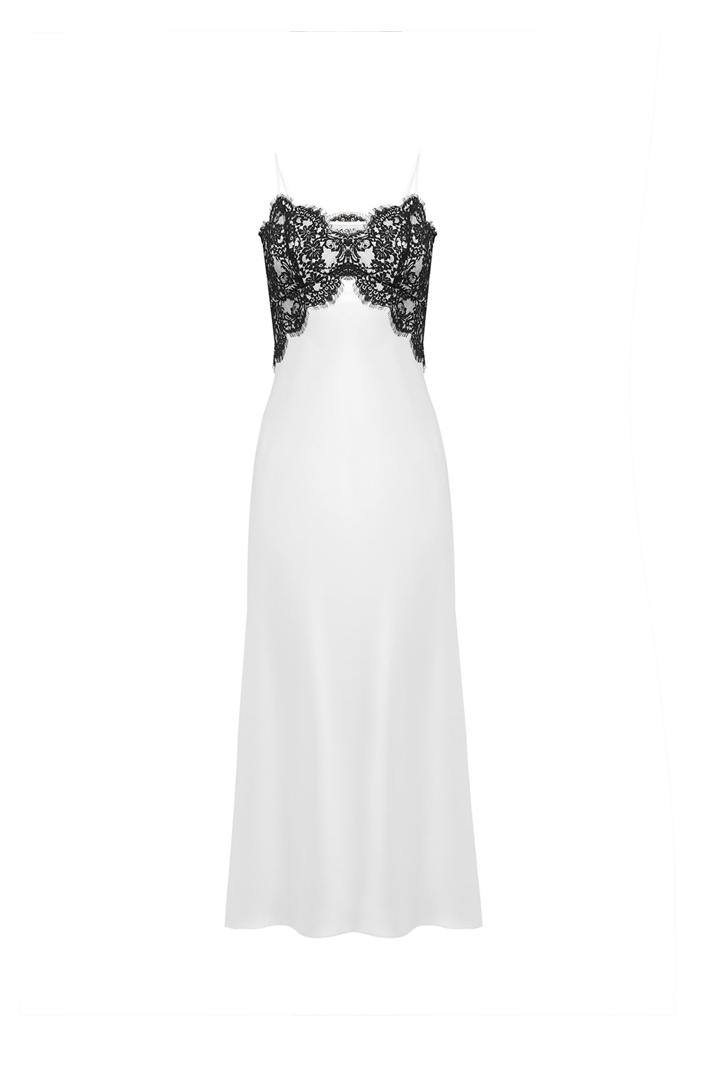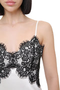 Elegant slip dress crafted from smooth satin, featuring contrasting black lace that highlights the neckline and adds a refined, sensual touch. The fluid silhouette softly follows the body, creating a delicate and feminine look.