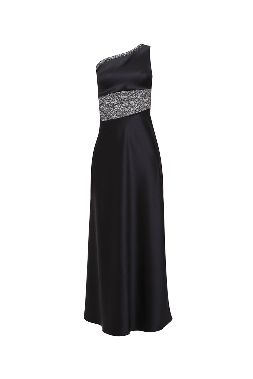 A refined satin midi dress featuring an asymmetric one shoulder silhouette and a delicate lace panel that highlights the waist. The contrast between smooth fabric and sheer texture creates a sculpted, feminine shape with a modern edge.