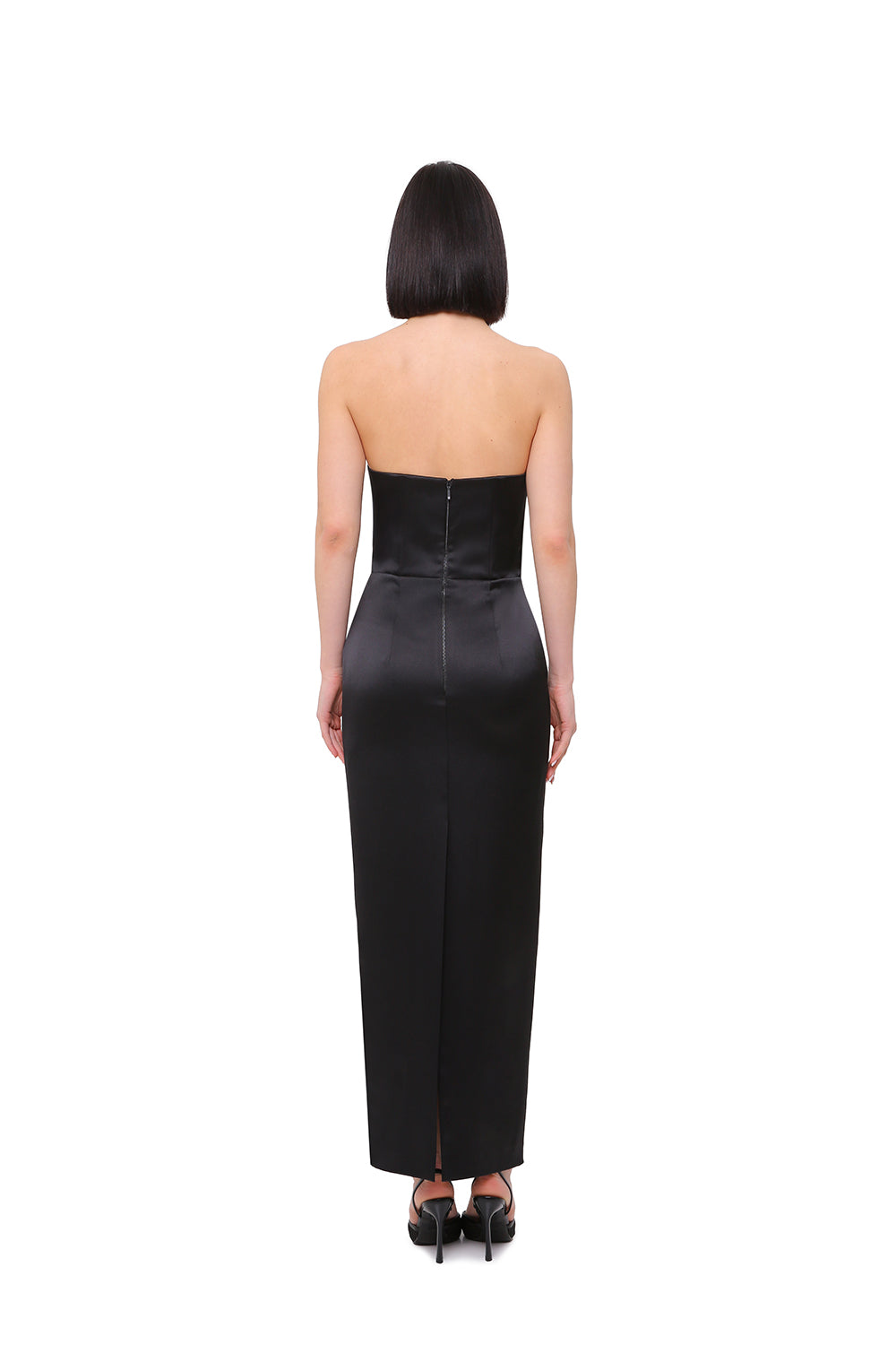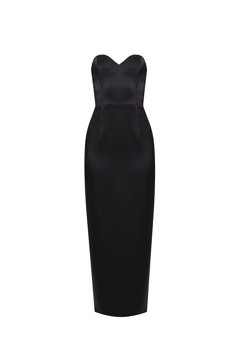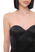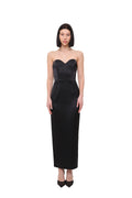 A refined corset midi dress crafted in smooth satin, designed to sculpt a clean and elegant silhouette. The structured bodice with a soft sweetheart neckline enhances the shape, while the minimalist cut keeps the look timeless and sophisticated.