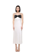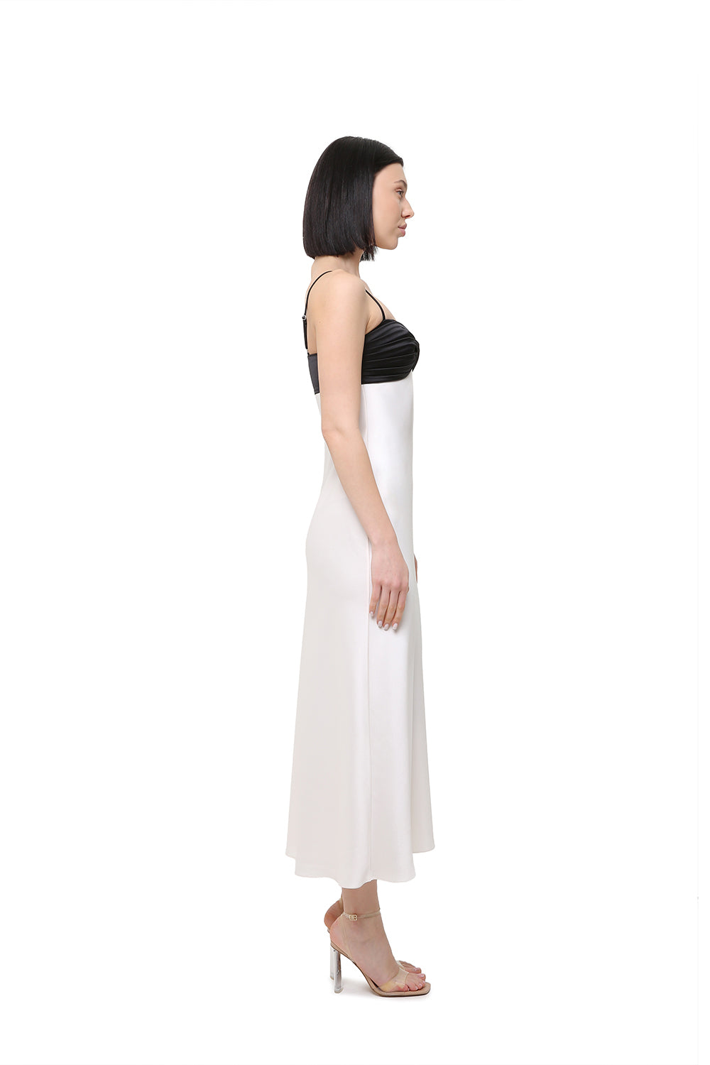 Elegant satin dress featuring a contrasting black draped bodice that adds structure and a bold accent to the soft ivory base. The silhouette flows smoothly along the body, creating a refined and elongated shape.