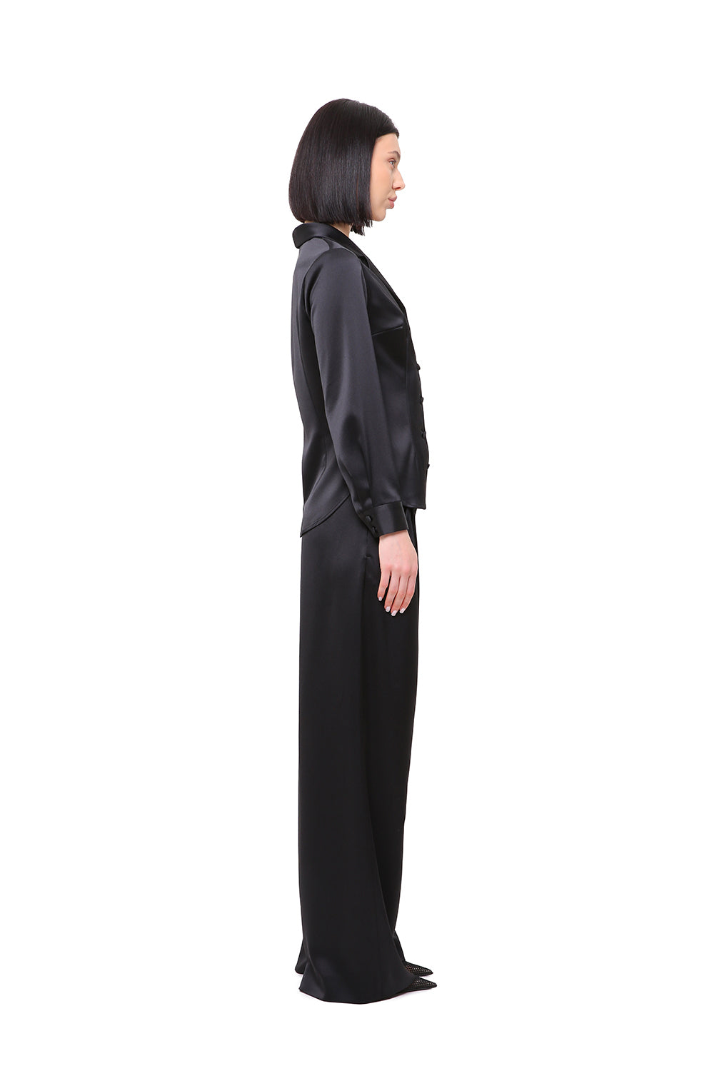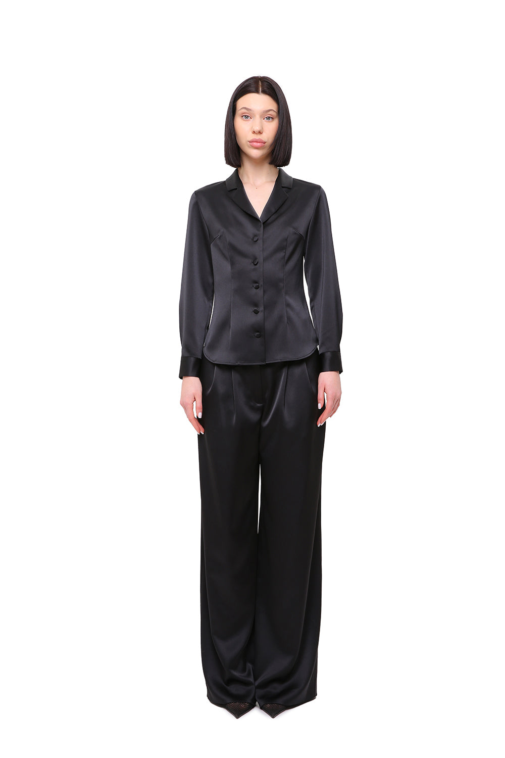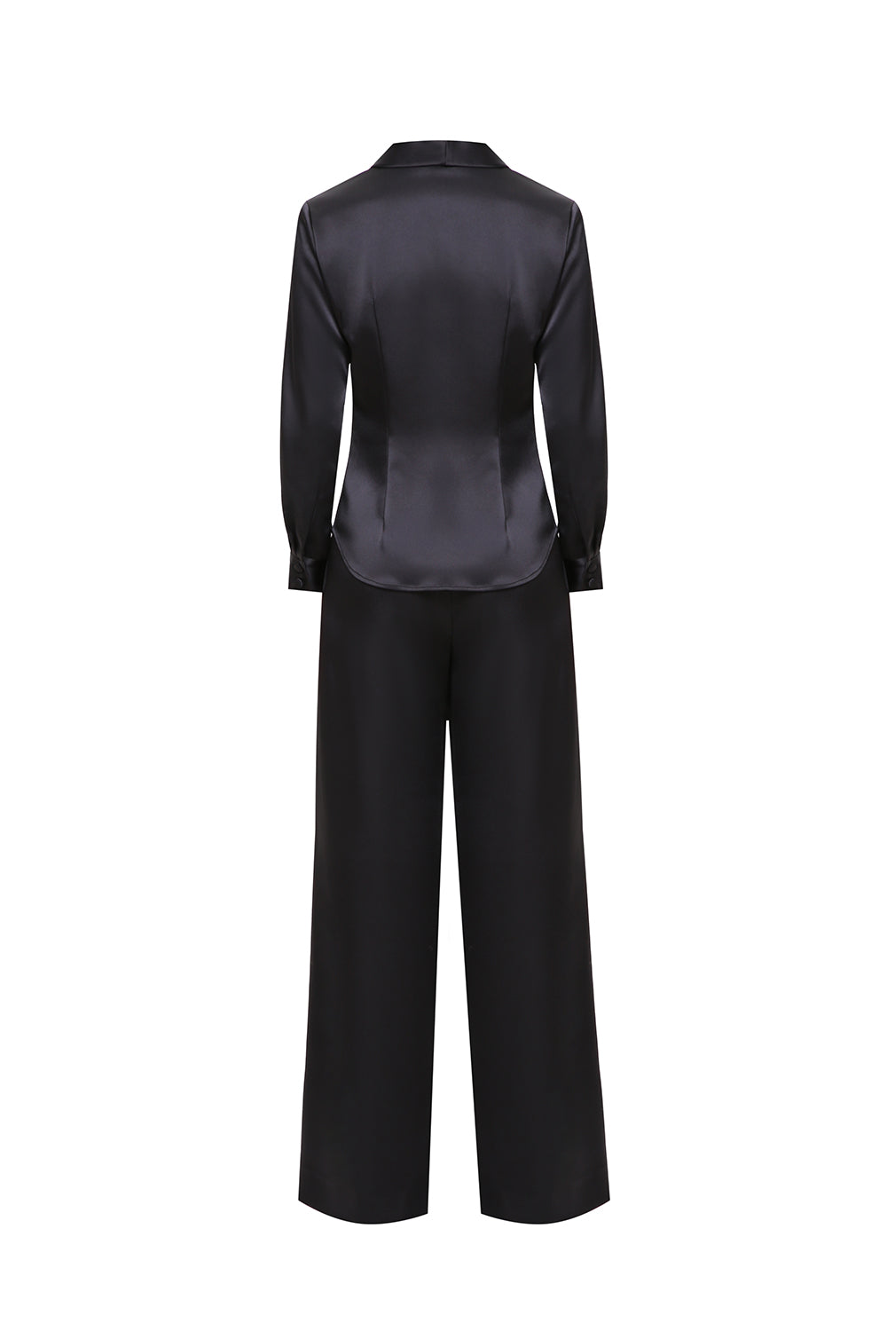 A refined satin set featuring a structured button-down shirt and fluid wide-leg trousers. The clean tailoring enhances the silhouette, while the soft sheen of the fabric adds depth and elegance.