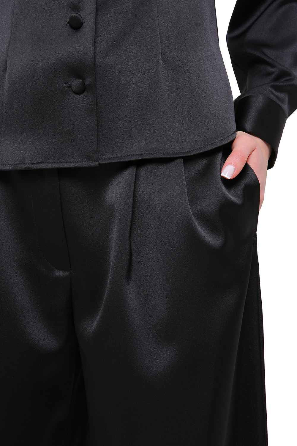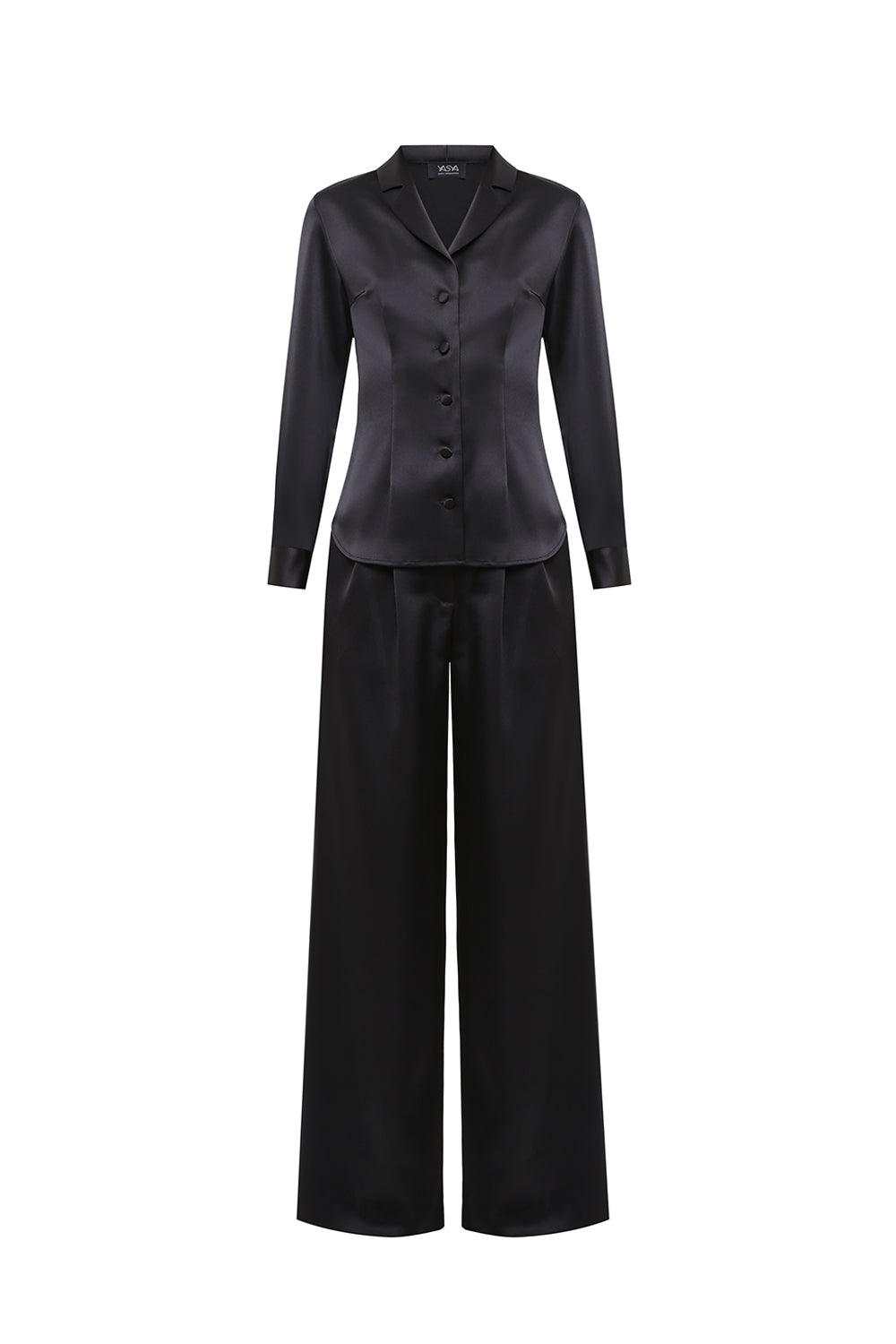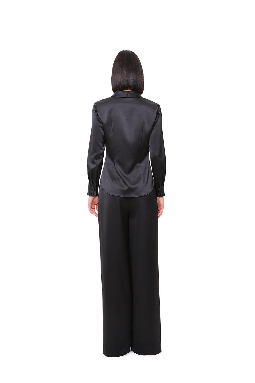 A refined satin set featuring a structured button-down shirt and fluid wide-leg trousers. The clean tailoring enhances the silhouette, while the soft sheen of the fabric adds depth and elegance.