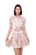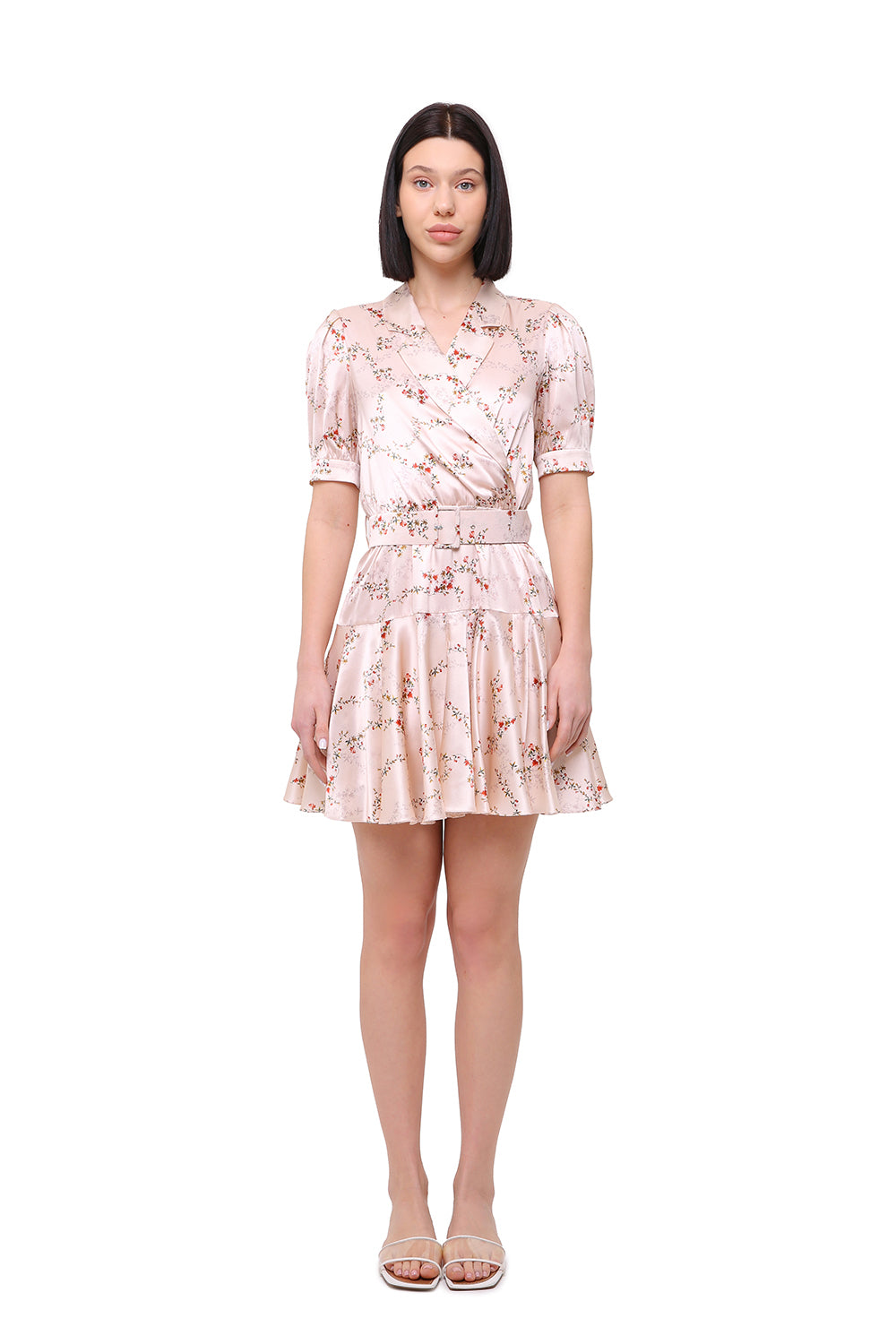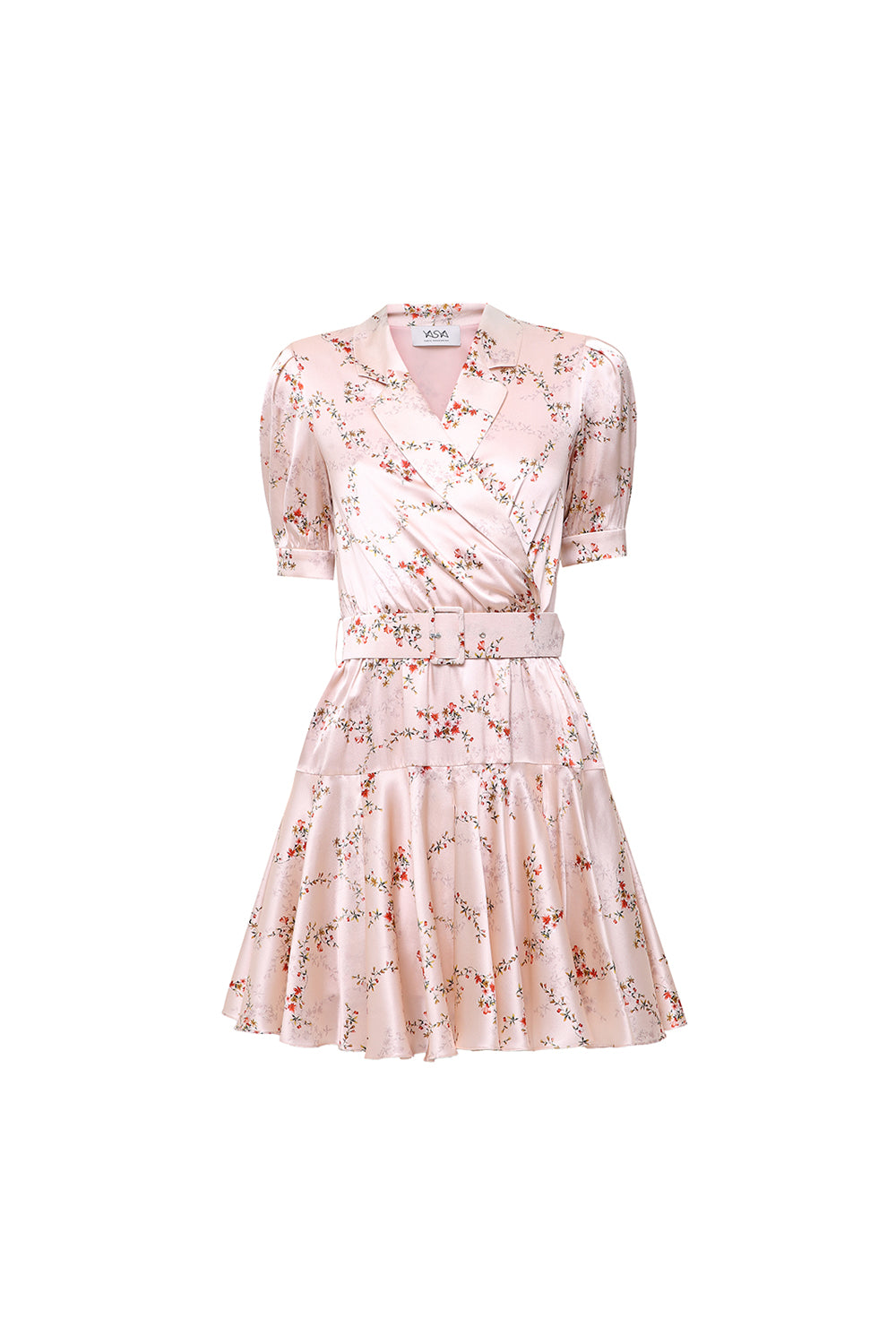 A feminine silk mini dress designed with a soft wrap silhouette, short sleeves, and a matching belt that accentuates the waist.