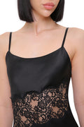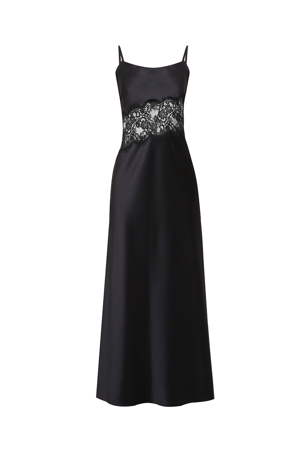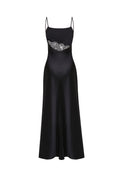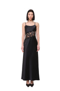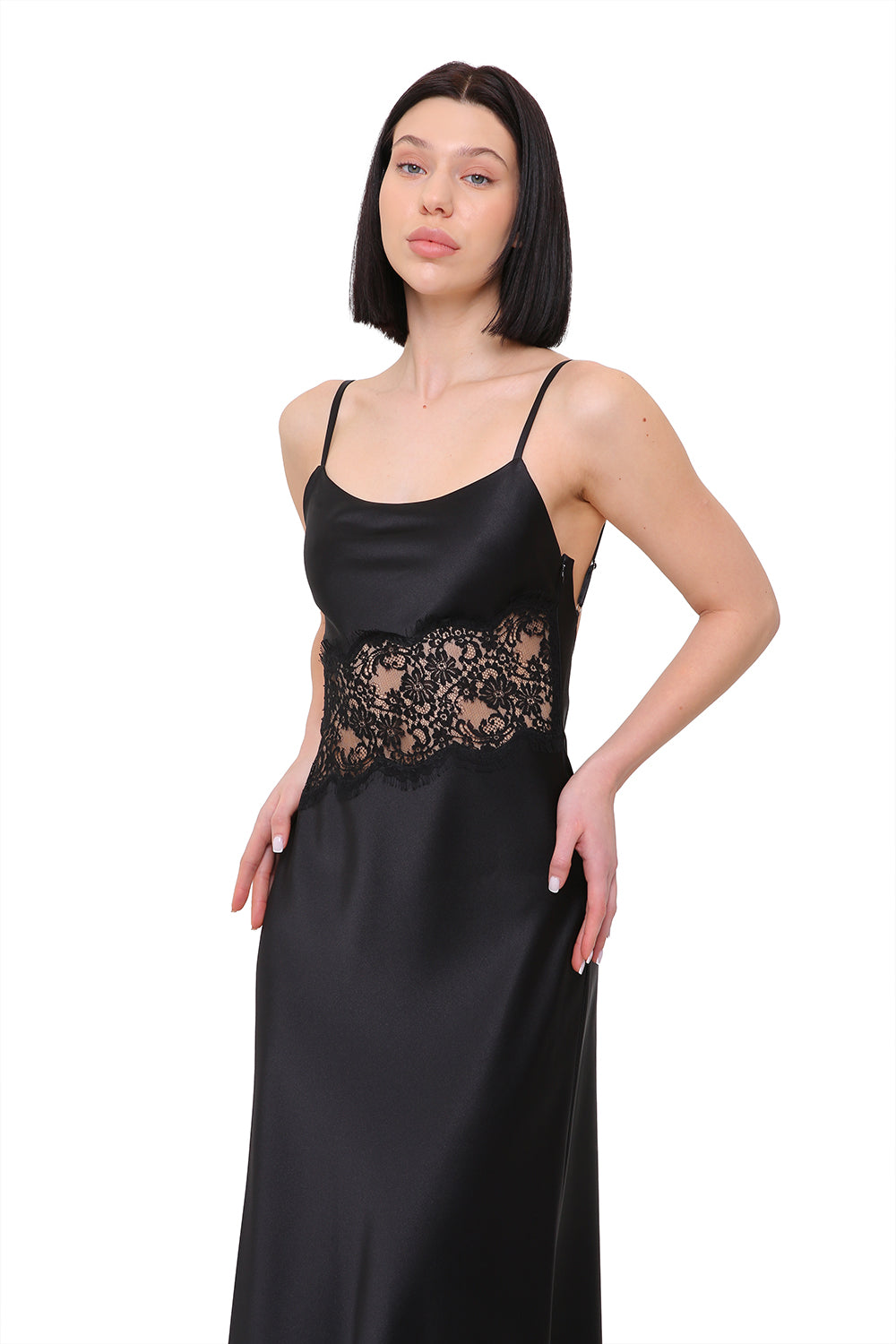 A fluid silk midi dress with a delicate lace insert that softly reveals the silhouette. The open back adds a sensual touch, while the smooth fabric drapes effortlessly over the body.