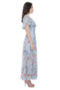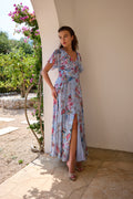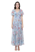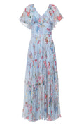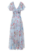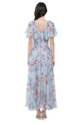 The Celestine Dress features a vibrant floral print. V-neckline leads to darted bust and column silhouette. Short, ruffle sleeves. Concealed back zip closure.
