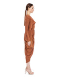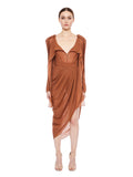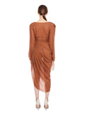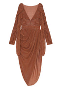 The Genevive dress is the perfect stand out piece for your wardrobe. Crafted from a beautiful pattern silk, featuring longsleeves and a draped wrapped skirt. You'll be shimmering all night long.