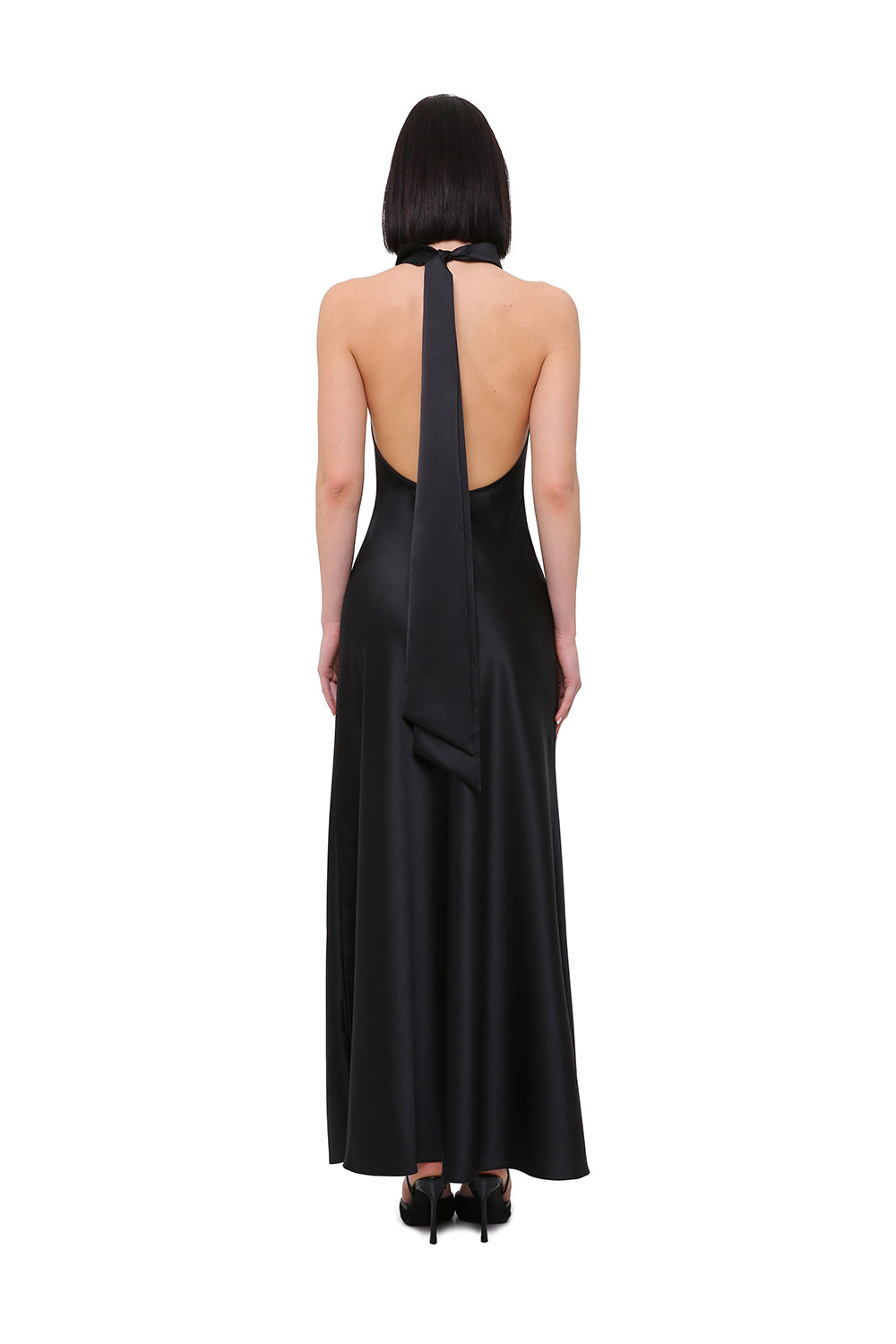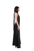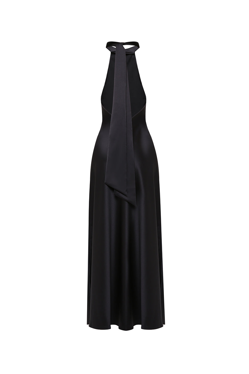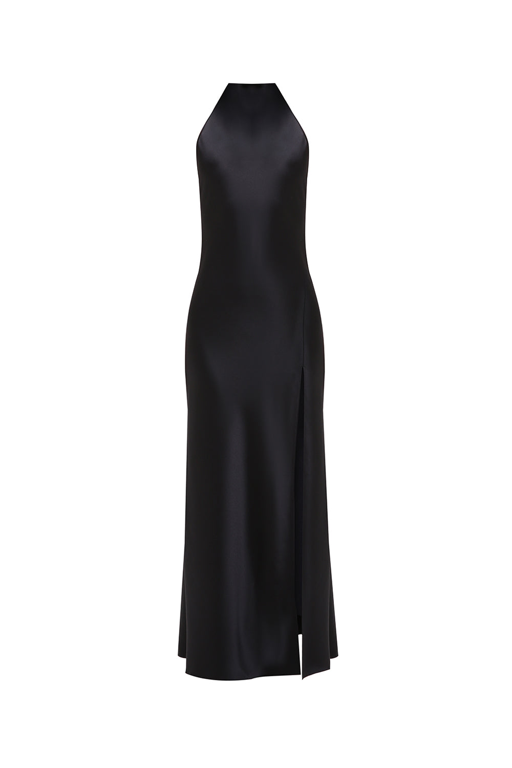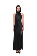 Elegant halter-neck dress crafted from smooth satin that softly follows the silhouette, creating a clean and elongated line. The deep black shade enhances the sleekness of the design, while the high slit adds movement and a subtle touch of sensuality.