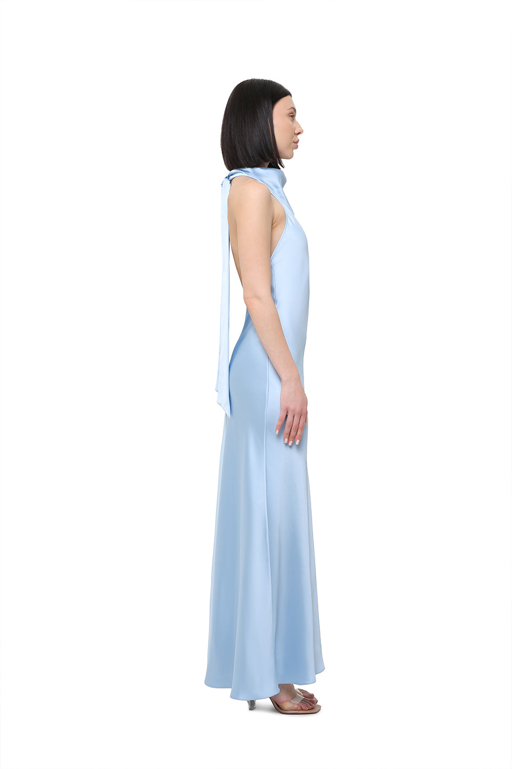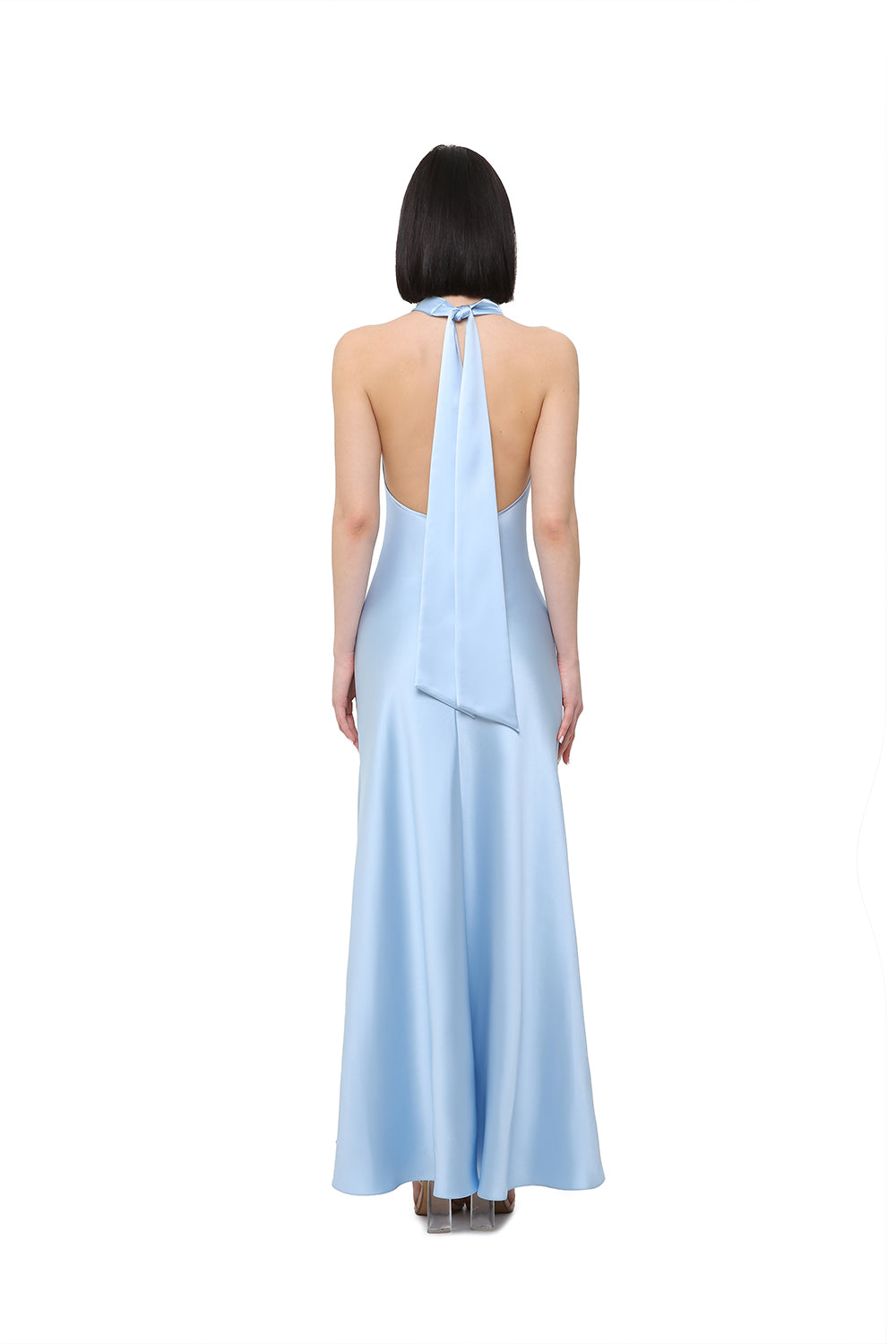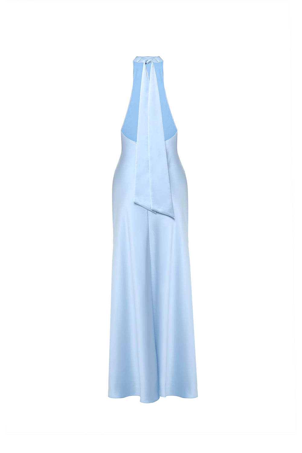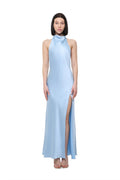 Elegant halter-neck dress crafted from smooth satin that softly follows the silhouette, creating a clean and elongated line. The soft sky blue shade adds lightness and freshness, while the high slit brings fluid movement and subtle femininity.